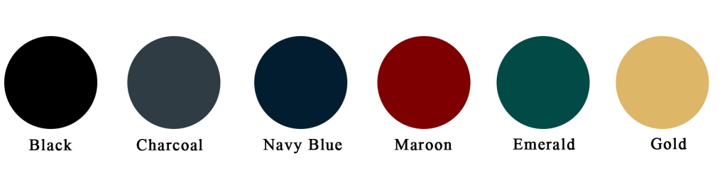 Black, Charcoal, Navy Blue, Maroon, Emerald, Gold